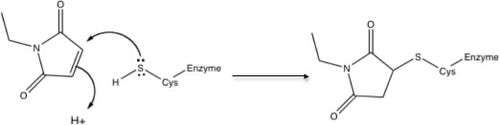 NEM is a Michael acceptor in the Michael reaction, which means that it adds into nucleophiles such as thiols. The resulting thioether features is a strong C–S bond and the reaction is virtually irreversible. Reaction with thiols occur in the pH range 6.5–7.5, NEM may react with amines or undergo hydrolysis at a more alkaline pH. NEM has been widely used to probe the functional role of thiol groups in enzymology. NEM is an irreversible inhibitor of all cysteine peptidases, with alkylation occurring at the active site thiol group (see schematic).[3][4]