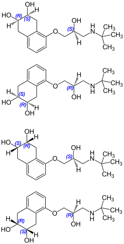 Nadolol is a mixture of stereoisomers. It is polar and hydrophilic, with low lipid solubility.[25] Its experimental log P is 0.71 to 1.2 per different sources.[26]