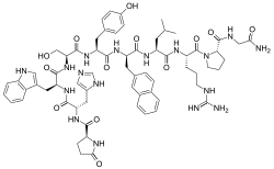 Nafarelin is a GnRH analogue, or a synthetic analogue of GnRH.[1][2][21] It is a decapeptide and is also known as [6-D-(2-naphthyl)alanine]-GnRH.[21][25] Nafarelin is marketed for medical use in both its free base (nafarelin) and acetate salt (nafarelin acetate) forms.[12]