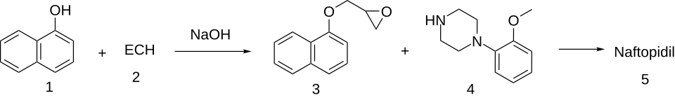 The reaction of 1-naphthol (1) with epichlorohydrin (2) in the presence of alkali gives the epoxide (3). Alkylation of the piperazine derivative (4) yields naftopidil.[2][3][4]