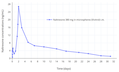 - ^ a b Dunbar JL, Turncliff RZ, Dong Q, Silverman BL, Ehrich EW, Lasseter KC (March 2006). "Single- and multiple-dose pharmacokinetics of long-acting injectable naltrexone". Alcoholism: Clinical and Experimental Research. 30 (3): 480–490. doi:10.1111/j.1530-0277.2006.00052.x. PMID 16499489.
