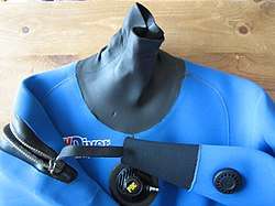 ![]() A neck seal, wrist seal, manual vent, inflator, zip and fabric of a neoprene dry suit. The soft seal material at the neck and wrists is made from single backed closed-cell foam neoprene for elasticity. The slick unbacked side seals against the skin. The blue area is double-backed with knit nylon fabric laminated onto closed cell foamed neoprene for toughness. Some insulation is provided by the suit, and the rest by garments worn underneath.