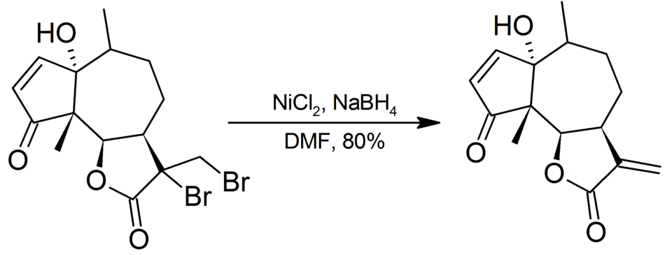 For aryl bromides, the modified system Ni(PPh3)3Cl2/NaBH4 in dimethylformamide is used for clean debromination. Reductive cleavage of iodides occurs with retention of configuration.[1]
