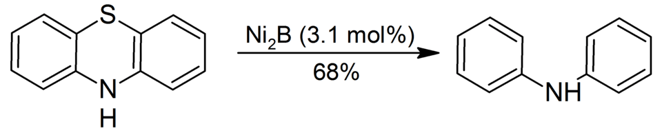 The NiCl2/NaBH4 system desulfurizes thioamides, thioethers, thioesters, thiols and sulfides. Organic sulfides, disulfides, thiols, and sulfoxides are reduced by NiCl2/NaBH4 to hydrocarbons. Illustrated is the reduction of phenothiazine to diphenylamine: