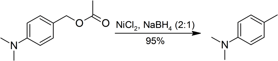 The H2/Ni2B system will not hydrogenolyse ethers, alcohols, aldehydes, amines and amides as it reduces alkenes in preference, even under forcing conditions. It leaves epoxides unaffected, but affects cyclopropanes occasionally. Most esters are stable to Ni2B, except for benzylic, allylic and propargylic esters which are cleaved by hydrogenolysis:[1]
