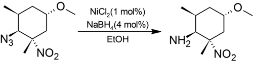 The NiCl2/NaBH4 system reduces aliphatic nitro groups, nitriles and oximes completely to amines. For aryl amines, nitrobenzenes are converted to anilines, and azoxybenzenes to azobenzenes. Azides are cleanly reduced to amines in preference to sterically hindered aliphatic nitro groups:[1]
