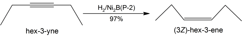 The catalytic activity of P−1 is insensitive to steric hindrance of side chains on the substrate and thus more active, and seldom affects protecting groups. In contrast, P−2 is very sensitive to steric factors.[1] For these reasons, P−1 is usually used for the complete reduction of unsaturated hydrocarbons under mild conditions, while P−2 is useful in partial reductions such as converting alkynes to alkenes in high yields:[13]