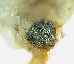 The mineral millerite is also a nickel sulfide with the molecular formula NiS, although its structure differs from synthetic stoichiometric NiS due to the conditions under which it forms. It occurs naturally in low temperature hydrothermal systems, in cavities of carbonate rocks, and as a byproduct of other nickel minerals.[8]