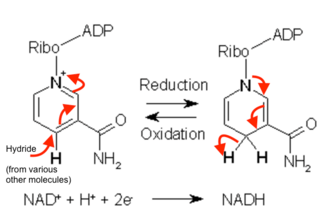 NAD+ acts as an electron carrier that mediates the interconversion of energy between nutrients and the cell's energy currency, adenosine triphosphate (ATP). In oxidation-reduction reactions, the active part of the cofactor is the nicotinamide. In NAD+, the nitrogen in the aromatic nicotinamide ring is covalently bonded to adenine dinucleotide. The shared electrons of the other carbon atoms in the aromatic ring stabilize the formal charge on the nitrogen. When a hydride atom is added onto NAD+ to form NADH, the molecule loses its aromaticity and therefore a good amount of stability. This higher energy product later releases its energy with the release of a hydride, and in the case of the electron transport chain, it assists in forming adenosine triphosphate.[37]
