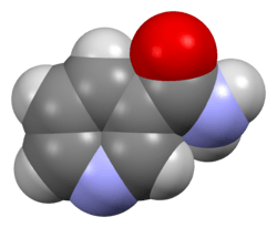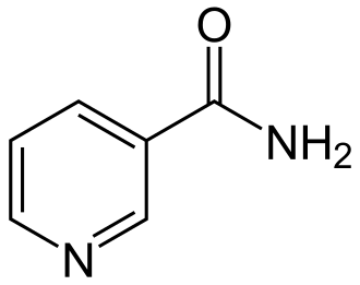 Nicotinamide (INN, BAN UK[2]) or niacinamide (USAN US) (IUPAC name: 3-pyridinecarboxoamide) is a form of vitamin B3 found in food and used as a dietary supplement and medication.[3][4][5] As a supplement, it is used orally (swallowed by mouth) to prevent and treat pellagra (niacin deficiency).[4] This is not to be confused with Niacin. While both are very similar both have different behaviors on the body. While nicotinic acid (niacin) may be used for this purpose, nicotinamide has the benefit of not causing skin flushing.[4] As a cream, it is used to treat acne, and has been observed in clinical studies to improve the appearance of aging skin by reducing hyperpigmentation and redness.[5][6] It is a water-soluble vitamin.