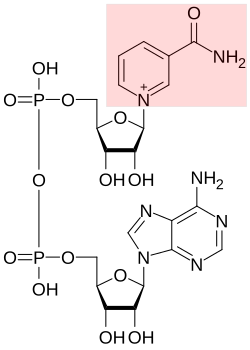 Nicotinamide occurs as a component of a variety of biological systems, including within the vitamin B family and specifically the vitamin B3 complex.[11][12] It is also a critically important part of the structures of NADH and NAD+, where the N-substituted aromatic ring in the oxidised NAD+ form undergoes reduction with hydride attack to form NADH.[35] The NADPH/NADP+ structures have the same ring, and are involved in similar biochemical reactions.