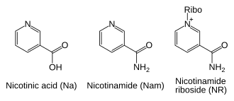 Besides assembling NAD+ de novo from simple amino acid precursors, cells also salvage preformed compounds containing a pyridine base. The three vitamin precursors used in these salvage metabolic pathways are nicotinic acid (NA), nicotinamide (Nam) and nicotinamide riboside (NR).[8] These compounds can be taken up from the diet and are termed vitamin B3 or niacin. However, these compounds are also produced within cells and by digestion of cellular NAD+. Some of the enzymes involved in these salvage pathways appear to be concentrated in the cell nucleus, which may compensate for the high level of reactions that consume NAD+ in this organelle.[43] There are some reports that mammalian cells can take up extracellular NAD+ from their surroundings,[44] and both nicotinamide and nicotinamide riboside can be absorbed from the gut.[45]