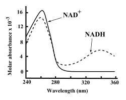 Both NAD+ and NADH strongly absorb ultraviolet light because of the adenine. For example, peak absorption of NAD+ is at a wavelength of 259 nanometers (nm), with an extinction coefficient of 16,900 M−1cm−1. NADH also absorbs at higher wavelengths, with a second peak in UV absorption at 339 nm with an extinction coefficient of 6,220 M−1cm−1.[13] This difference in the ultraviolet absorption spectra between the oxidized and reduced forms of the coenzymes at higher wavelengths makes it simple to measure the conversion of one to another in enzyme assays – by measuring the amount of UV absorption at 340 nm using a spectrophotometer.[13]