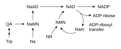 Most organisms synthesize NAD+ from simple components.[8] The specific set of reactions differs among organisms, but a common feature is the generation of quinolinic acid (QA) from an amino acid – either tryptophan (Trp) in animals and some bacteria, or aspartic acid (Asp) in some bacteria and plants.[35][36] The quinolinic acid is converted to nicotinic acid mononucleotide (NaMN) by transfer of a phosphoribose moiety. An adenylate moiety is then transferred to form nicotinic acid adenine dinucleotide (NaAD). Finally, the nicotinic acid moiety in NaAD is amidated to a nicotinamide (Nam) moiety, forming nicotinamide adenine dinucleotide.[8]