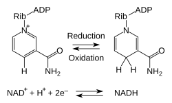 The compound accepts or donates the equivalent of H−.[8] Such reactions (summarized in formula below) involve the removal of two hydrogen atoms from a reactant (R), in the form of a hydride ion (H−), and a proton (H+). The proton is released into solution, while the reductant RH2 is oxidized and NAD+ reduced to NADH by transfer of the hydride to the nicotinamide ring.