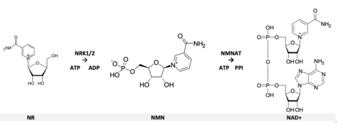 In 2004, a previously unknown pathway was reported when nicotinamide riboside (NR) was identified as an additional NAD+ precursor in eukaryotes.[11][13][14] NR is now recognized as a form of vitamin B3[15] which can be found in both cow and human milk.[11][16] Once internalized into a cell, NR is rapidly phosphorylated by the activity of nicotinamide riboside kinase enzymes (NRK1 and NRK2) to form nicotinamide mononucleotide (NMN), bypassing the previously known biosynthetic routes to NAD+ production. NMN is then converted to NAD+ by NMN-adenylyltransferase (NMNAT).[13]