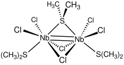 - ^ Kakeya, Masaki; Fujihara, Takashi; Nagasawa, Akira (2006). "Di-μ-chloro-μ-(dimethyl sulfide)-bis[dichloro(dimethyl sulfide)niobium(III)]". Acta Crystallographica Section E. 62 (3): m553–m554. Bibcode:2006AcCrE..62M.553K. doi:10.1107/S1600536806005149.