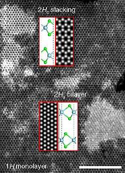 ![]() Electron micrograph showing a local coexistence of different NbSe2 structures in one sample