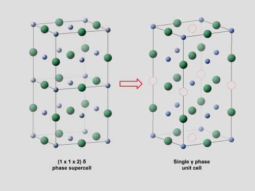 - γ-Nb4N3 also written γ-NbNx (0.72 < x < 0.84) — a body-centered tetragonal structure (space group I4/mmm).5 This phase is stable below Ttransition and transforms into δ-NbNx above. It is known that the delta phase transforms into gamma by assembling a 1 x 1 x 2 supercell which has ordered vacancies as shown right. Despite this, the detailed mechanism of the δ → γ transformation remains unresolved.