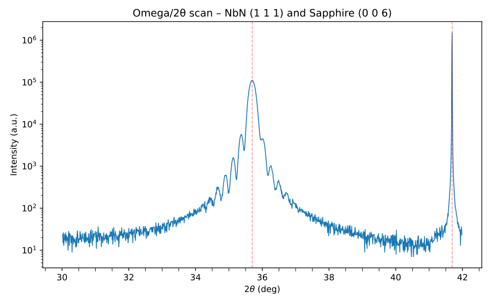 The above table presents powder diffraction data simulated in VESTA for cubic δ-NbN. It lists all allowed reflections for a randomly oriented crystallite ensemble. The ω–2θ scan shown right has a single strong NbN (111) peak at 35.7°, accompanied by clear thickness fringes. These fringes result from interference between X-rays reflected at the film surface and the film–substrate interface, and their visibility indicates a smooth, uniform, and well-defined epitaxial NbN layer. These fringes are characteristic of epitaxy.