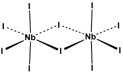 Niobium pentaiodide is the inorganic compound with the formula Nb2I10. Its name comes from the compound's empirical formula, NbI5.[1] It is a diamagnetic, yellow solid that hydrolyses readily. The compound adopts an edge-shared bioctahedral structure, which means that two NbI5 units are joined by a pair of iodide bridges. There is no bond between the Nb centres.[2] Niobium(V) chloride, niobium(V) bromide, tantalum(V) chloride, tantalum(V) bromide, and tantalum(V) iodide, all share this structural motif.