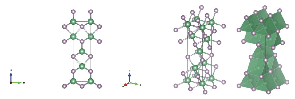 Niobium phosphide forms dark gray crystals of the non-centrosymmetric, tetragonal system, space group I4₁md (No. 109), with cell parameters a = 0.3334 nm, c = 1.1378 nm, Z = 4.[7][8], the same structure type as other transition-metal monopnictide Weyl semimetals such as TaAs and NbAs. The unit cell contains four formula units, and each niobium atom is coordinated by six phosphorus atoms and vice versa, forming a three-dimensional network of distorted polyhedra [4].