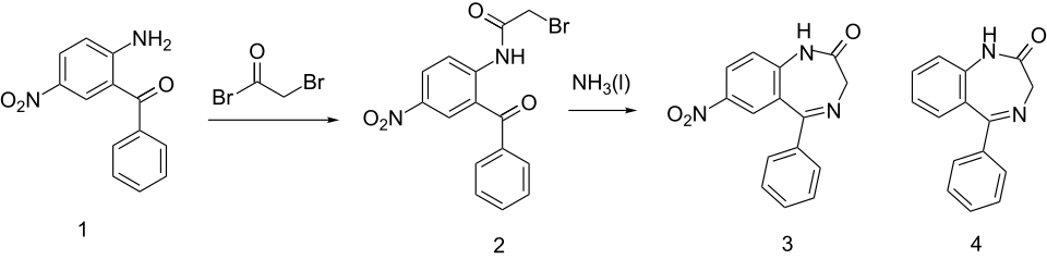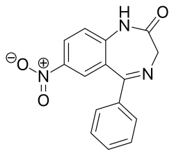 - ^ Sternbach LH, Fryer RI, Keller O, Metlesics W, Sach G, Steiger N (May 1963). "Quinazolines and 1,4-Benzodiazepines. X. Nitro-Substituted 5-Phenyl-1,4-Benzodiazepine Derivatives". Journal of Medicinal Chemistry. 6 (3): 261–265. doi:10.1021/jm00339a010. PMID 14185980.