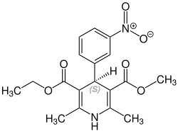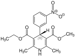 Nitrendipine contains a stereocenter and can exist as either of two enantiomers. The pharmaceutical drug is a racemate, an equal mixture of (R)- and the (S)-forms.[6]