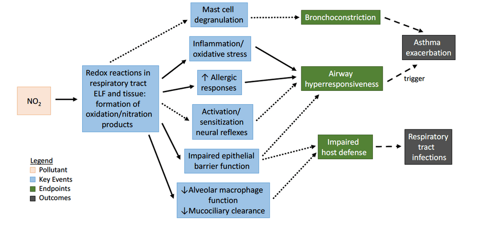 NO2 diffuses into the epithelial lining fluid (ELF) of the respiratory epithelium and dissolves. There, it chemically reacts with antioxidant and lipid molecules in the ELF. The health effects of NO2 are caused by the reaction products or their metabolites, which are reactive nitrogen species and reactive oxygen species that can drive bronchoconstriction, inflammation, reduced immune response, and may have effects on the heart.[33]