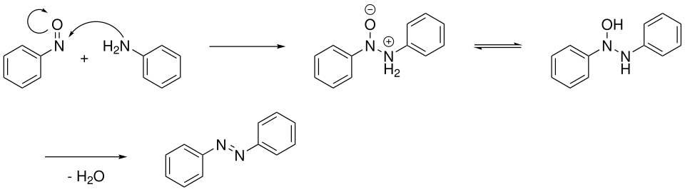 Nitrosobenzene undergoes Diels–Alder reactions with dienes.[8] Condensation with anilines affords azobenzene derivatives in a reaction known as the Mills reaction or Baeyer-Mills reaction.[9] Reduction of nitrosobenzene produces aniline.