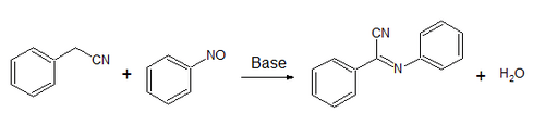 Most characteristically, nitrosobenzene condenses with active methylene groups, such as those of malonic esters and phenylacetonitrile. Phenylacetonitrile (PhCH2CN) gives the imine (PhC(CN)=NPh) in a reaction known as the Ehrlich-Sachs reaction:[10]