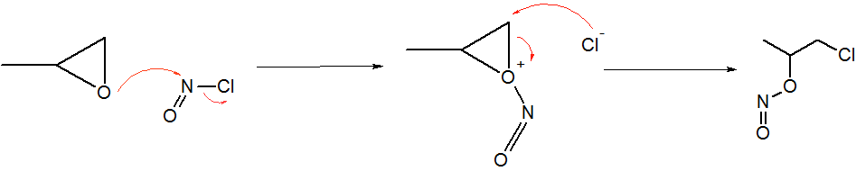 Epoxides react with NOCl to give an α-chloronitritoalkyl derivatives. In the case of propylene oxide, the addition proceeds with high regiochemistry:[14]