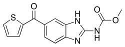 It is related to mebendazole by replacement of the left most benzene ring by thiophene.