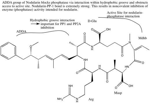 An initial noncovalent interaction involving the ADDA side chain (specifically where ADDA has a 6E double bond) of the nodularin and a free D-glutamyl carboxyl group off a cyclic structure of the phosphatase is the source of toxicity. The ADDA group blocks enzyme (phosphatase) activity by interacting with hydrophobic groove and obstructing substrate access to active site cleft. The toxin-phosphatase bond interactions (nodularin-PP-1, nodularin-PP-2A) are extremely strong. This leads to inhibition of the enzyme activity. Of note, nodularins differ from microcystins here: nodularins bind noncovalently to protein phosphatases while microcystins bind covalently.[18]