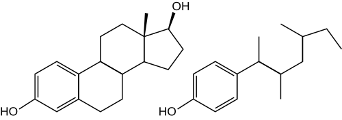 Alkylphenols like nonylphenol and bisphenol A have estrogenic effects in the body. They are known as xenoestrogens.[28] Estrogenic substances and other endocrine disruptors are compounds that have hormone-like effects in both wildlife and humans. Xenoestrogens usually function by binding to estrogen receptors and acting competitively against natural estrogens. Nonylphenol has been shown to mimic the natural hormone 17β-estradiol, and it competes with the endogenous hormone for binding with the estrogen receptors ERα and ERβ.[2] Nonylphenol was discovered to have hormone-like effects by accident because it contaminated other experiments in laboratories that were studying natural estrogens that were using polystyrene tubes.[11]
