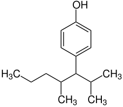Nonylphenols are a family of closely related organic compounds composed of phenol bearing a 9 carbon-tail. Nonylphenols can come in numerous structures, all of which may be considered alkylphenols. They are used in manufacturing antioxidants, lubricating oil additives, laundry and dish detergents, emulsifiers, and solubilizers.[2] They are used extensively in epoxy formulation in North America[3][4] but its use has been phased out in Europe.[5] These compounds are also precursors to the commercially important non-ionic surfactants alkylphenol ethoxylates and nonylphenol ethoxylates, which are used in detergents, paints, pesticides, personal care products, and plastics. Nonylphenol has attracted attention due to its prevalence in the environment and its potential role as an endocrine disruptor and xenoestrogen, due to its ability to act with estrogen-like activity.[6] The estrogenicity and biodegradation heavily depends on the branching of the nonyl sidechain.[7][8][9] Nonylphenol has been found to act as an agonist of the GPER (GPR30).[10]