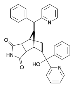 Norbormide is an organic compound with the following systematic name: 5-(α-hydroxy-α-2-pyridylbenzyl)-7-(α-2-pyridylbenzylidene)-5-norbornene-2,3-dicarboximide. The structure consists of a norbornene ring, that is merged with an imide ring opposite to the double bond. One of the carbon atoms of this double bond is connected to another carbon atom, that is bound to a hydroxyl, a pyridyl and a phenyl group. The bridging carbon of the norbornene ring is double bonded to a carbon atom to which a pyridyl and a phenyl group are attached.[9] There are eight possible stereoisomers of norbormide. On the exocyclic double bond there is cis/trans-isomerism. The imide ring can have an endo or an exo orientation and for the hydroxyl group erythro and threo isomers are possible.[10] The vasoconstrictor properties of norbormide turn out to be very dependent on stereochemistry. Only the endo isomers are toxic in rats and the threo isomers are ten times as potent as the erythro isomers.[1] The cis-endo-threo isomer has been found to be the isomer with the most potent vasoconstrictor properties.[11] In this structure there is a hydrogen bond between the hydroxyl group and the adjacent pyridine ring.[5] Studies reveal that norbormide toxicity is sensitive to structural changes, in almost all cases the toxicity decreases due to structural changes. Only substitution of the NH proton of the imide with certain groups could give toxic activity comparable to norbormide itself.[12]