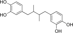 As a lignan, it is a member of one of the major classes of phytoestrogens. While it is commonly asserted that the biological properties of lignans per sé are void, and that only the enterolignans enterodiol and enterolactone, produced from lignans by intestinal bacteria have interesting biological properties,[1] nordihydroguaiaretic acid has antioxidant and anti-inflammatory properties in vitro or in animal models.[2] It is a redox-type inhibitor of 5-lipoxygenase.[3]