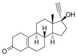 Noretynodrel, also known as 17α-ethynyl-δ5(10)-19-nortestosterone or as 17α-ethynylestr-5(10)-en-17β-ol-3-one, is a synthetic estrane steroid and a derivative of testosterone.[18][31] It is specifically a derivative of testosterone that has been ethynylated at the C17α position, demethylated at the C19 position, and dehydrogenated (i.e., has a double bond) between the C5 and C10 positions).[18][31] As such, noretynodrel is also a combined derivative of nandrolone (19-nortestosterone) and ethisterone (17α-ethynyltestosterone).[18][31] In addition, it is an isomer of norethisterone (17α-ethynyl-19-nortestosterone) in which the C4 double bond has been replaced with a double bond between the C5 and C10 positions.[18][31] For this reason, noretynodrel is also known as 5(10)-norethisterone.[18][31] Few other 19-nortestosterone progestins share the C5(10) double bond of noretynodrel, but examples of a couple that do include tibolone, the C7α methyl derivative of noretynodrel (i.e., 7α-methylnoretynodrel), and norgesterone, the C17α vinyl analogue of noretynodrel.[18][31]
