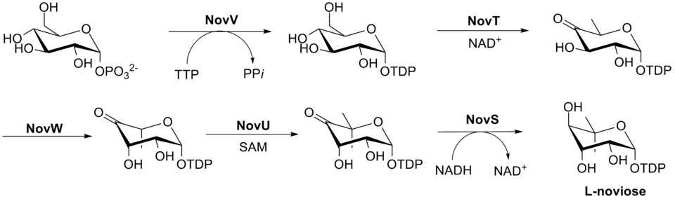 The biosynthesis of L-noviose (ring C) is shown in Fig. 3. This process starts from glucose-1-phosphate where NovV takes dTTP and replaces the phosphate group with a dTDP group. NovT then oxidizes the 4-hydroxy group using NAD+. NovT also accomplishes a dehydroxylation of the 6 position of the sugar. NovW then epimerizes the 3 position of the sugar.[28] The methylation of the 5 position is accomplished by NovU and S-adenosyl methionine (SAM). Finally NovS reduces the 4 position again to achieve epimerization of that position from the starting glucose-1-phosphate using NADH.
