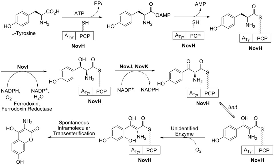 The biosynthesis of ring B (see Fig. 2) begins with the natural amino acid L-tyrosine. This is then adenylated and thioesterified onto the peptidyl carrier protein (PCP) of NovH by ATP and NovH itself.[26] NovI then further modifies this PCP bound molecule by oxidizing the β-position using NADPH and molecular oxygen. NovJ and NovK form a heterodimer of J2K2 which is the active form of this benzylic oxygenase.[27] This process uses NADP+ as a hydride acceptor in the oxidation of the β-alcohol. This ketone will prefer to exist in its enol tautomer in solution. Next a still unidentified protein catalyzes the selective oxidation of the benzene (as shown in Fig. 2). Upon oxidation this intermediate will spontaneously lactonize to form the aromatic ring B and lose NovH in the process.