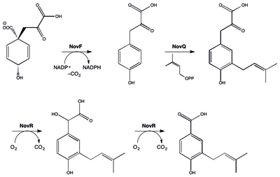 The biosynthesis of ring A (see Fig. 1) begins with prephenate which is a derived from the shikimic acid biosynthetic pathway. The enzyme NovF catalyzes the decarboxylation of prephenate while simultaneously reducing nicotinamide adenine dinucleotide phosphate (NADP+) to produce NADPH. Following this NovQ catalyzes the electrophilic substitution of the phenyl ring with dimethylallyl pyrophosphate (DMAPP) otherwise known as prenylation.[24] DMAPP can come from either the mevalonic acid pathway or the deoxyxylulose biosynthetic pathway. Next the 3-dimethylallyl-4-hydroxybenzoate molecule is subjected to two oxidative decarboxylations by NovR and molecular oxygen.[25] NovR is a non-heme iron oxygenase with a unique bifunctional catalysis. In the first stage both oxygens are incorporated from the molecular oxygen while in the second step only one is incorporated as determined by isotope labeling studies. This completes the formation of ring A.