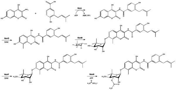 - ^ a b da Silva Eustáquio A (2004). Biosynthesis of aminocoumarin antibiotics in Streptomyces: Generation of structural analogues by genetic engineering and insights into the regulation of antibiotic production (Ph.D. thesis). Universität Tübingen.