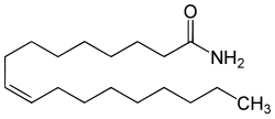 Oleamide is an organic compound with the formula CH3(CH2)7CH=CH(CH2)7CONH2.[3] It is the amide derived from the fatty acid oleic acid. It is a colorless waxy solid and occurs in nature. Sometimes labeled as a fatty acid primary amide (FAPA), it is biosynthesized from N-oleoylglycine.[4]