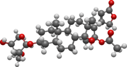 Oleandrin is a cardiac glycoside found in the poisonous plant oleander (Nerium oleander L.).[1] As a main phytochemical of oleander, oleandrin is associated with the toxicity of oleander sap, and has similar properties to digoxin.[1] Oleandrin and other oleander chemicals are potentially toxic to the heart, liver, and kidneys.[1]