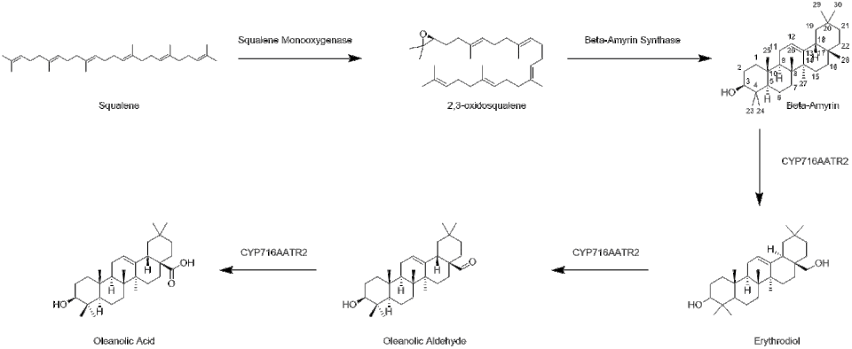 Oleanolic acid biosynthesis starts with mevalonate to create squalene. Squalene monooxygenase in the next step oxidases the squalene and forms an epoxide resulting in 2,3-oxidosqualene.[5] Beta-amyrin synthase creates beta-amyrin by a ring formation cascade.[5][6] After the formation of beta amyrin, CYP716AATR2, also known as a cytochrome p450 enzyme, oxidizes carbon 28 turning it into alcohol.[6] CYP716AATR2 converts the alcohol to aldehyde and finally to a carboxylic acid forming oleanolic acid.[6]