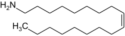 Oleylamine is an organic compound with a molecular formula C18H35NH2.[1] It is an unsaturated fatty amine related to the fatty acid oleic acid. The pure compound is a clear and colorless liquid. Commercially available oleylamine reagents[2][3][4][5][6] vary in colour from clear and colorless to varying degrees of yellow due to impurities. The major impurities include trans isomer (elaidylamine) and other long chain amines with varying chain lengths.[7] Minor impurities include oxygen-containing substances such as amides and nitroalkanes.[7]