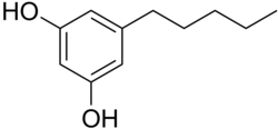 Olivetol is an organic compound with the formula C5H11C6H3(OH)2. Several isomers exist; olivetol has the two hydroxyl and the pentyl groups located at the 1,3, and 5 positions on the benzene ring. It is a colorless solid that is soluble in a variety of organic solvents. It is found in certain species of lichen. It is also a precursor in various syntheses of tetrahydrocannabinol.