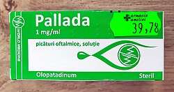 Brand names include Pallada, Pazeo, Pataday, Patanol S, Patanol, Opatanol, Olopat, Patanase.[18][19] It is also available as an oral tablet in Japan under the tradename Allelock, manufactured by Kyowa Hakko Kogyo.[20]