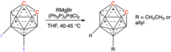 Iodinated derivatives of carborane can be further modified to access boron alkylated products via a cross coupling reaction. This can be done by treating the halogenated carborane with a Grignard reagent in the presence of a phosphine palladium complex. The bromo and chloro compounds do not react under the same conditions.[15]